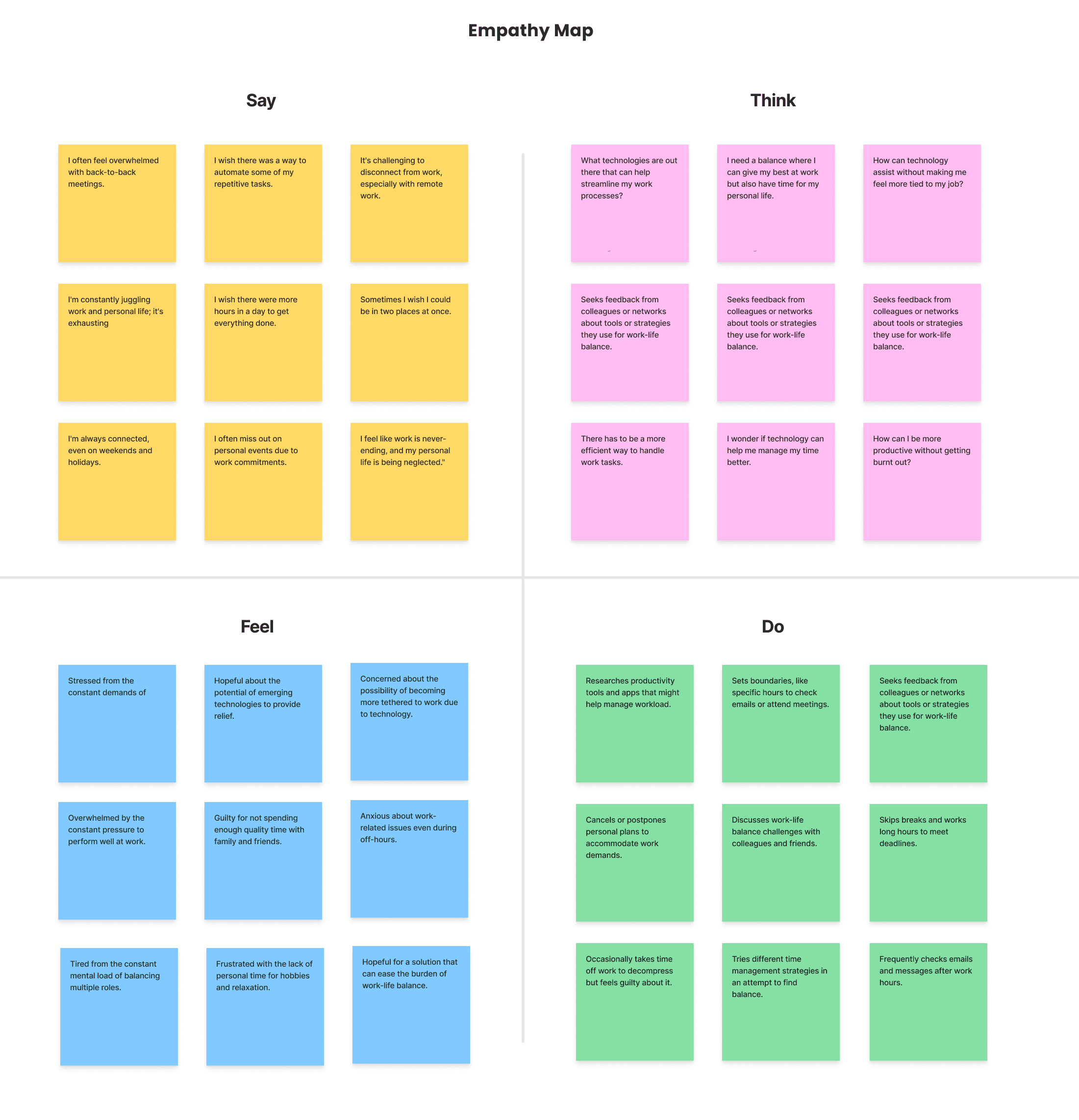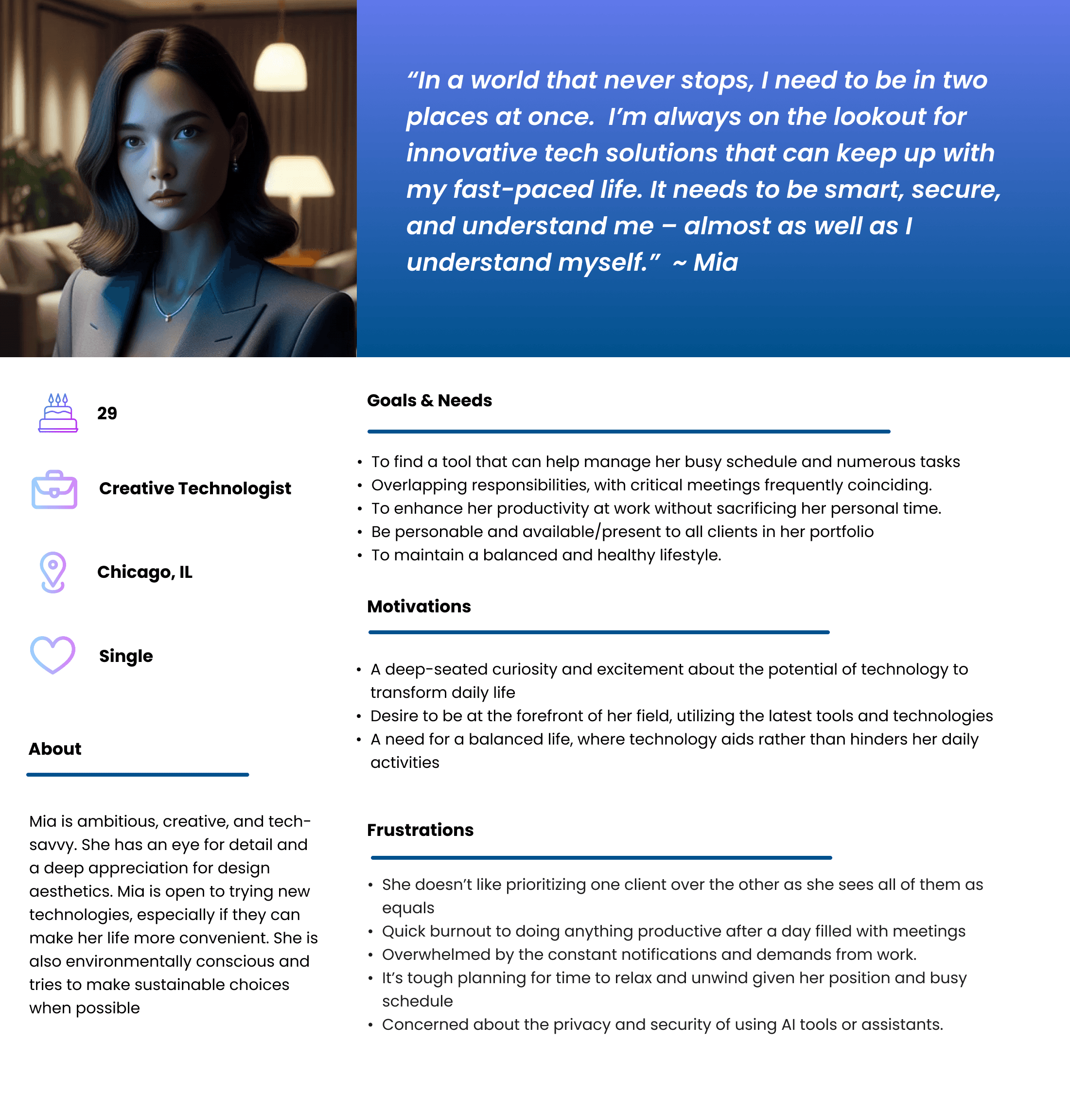 An empathy map distilled user frustrations and needs, birthing our persona, Mia - an executive craving efficiency without losing autonomy. This anchored our design in real human struggles.