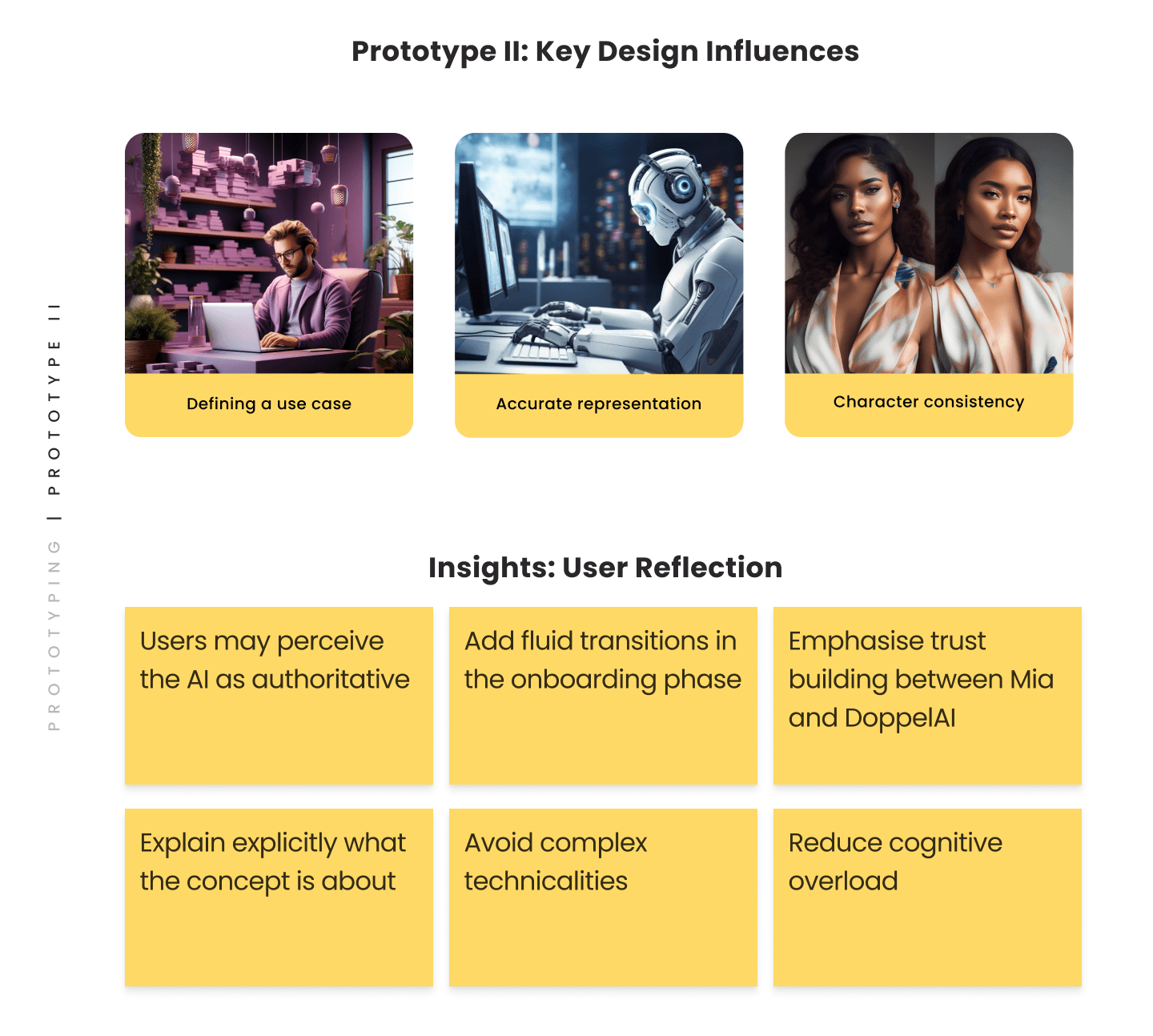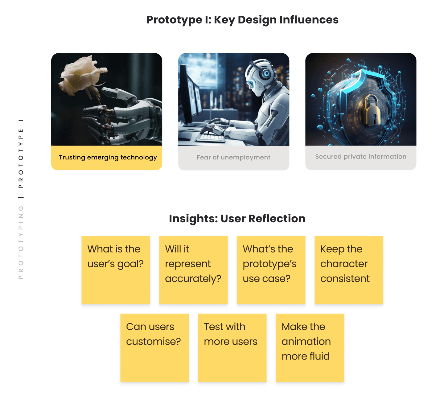 Prototypes evolved through iterations, each tackling LLM, AI, VUI, Blockchain, and 3D scanning concepts, refined via user feedback.