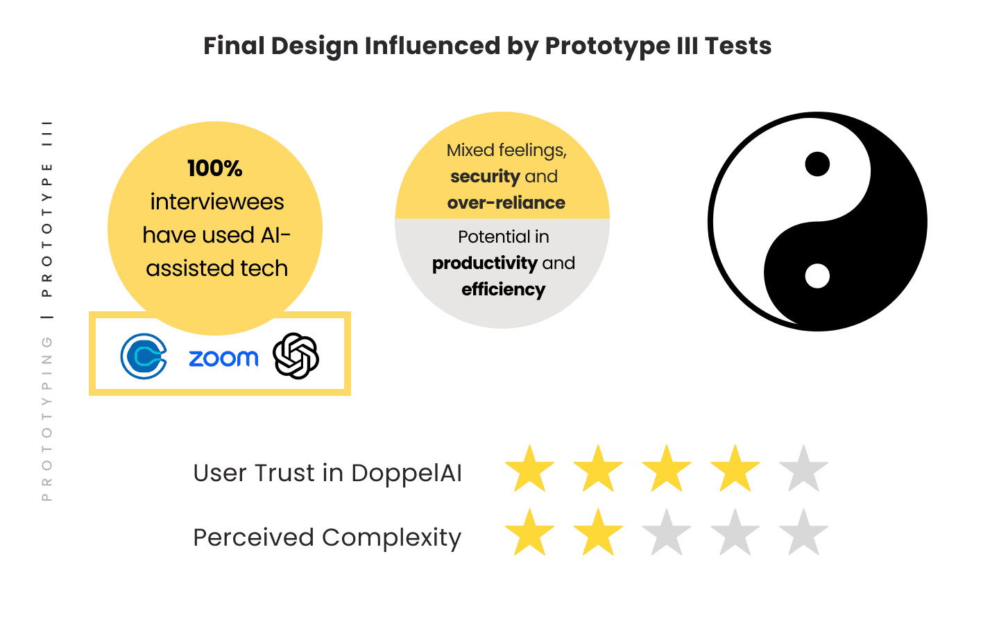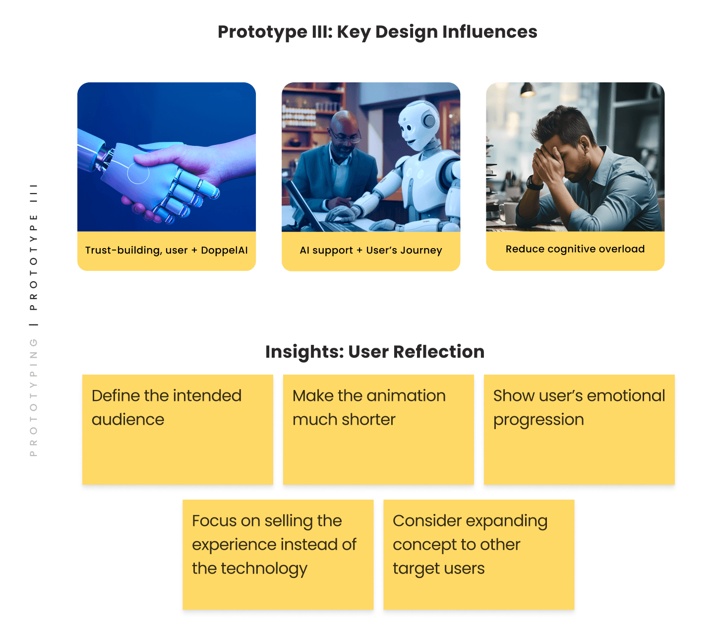 We conducted limited user testing, not for usability validation, but to understand conceptual reception and emotional response to AI delegation. Feedback helped refine the speculative narrative rather than optimize UI usability. Four C-suite users (18+, AI-experienced) tested Prototype III, yielding: