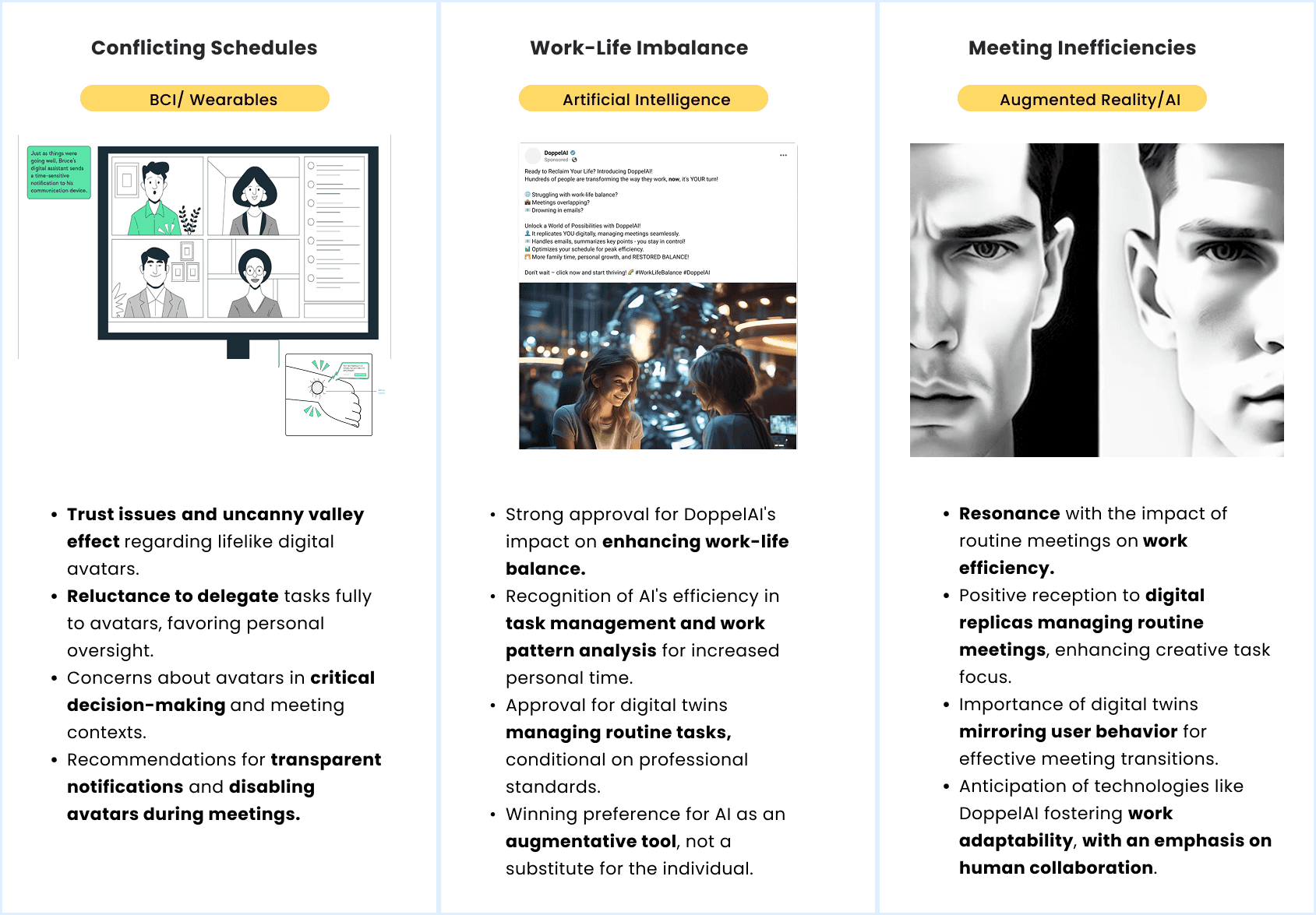 Brainstorming honed three narratives around the top pain points: conflicting schedules, work-life imbalance, and meeting inefficiencies. User feedback revealed a hunger for control, trust, and simplicity in AI solutions, insights that shaped DoppelAI’s direction.