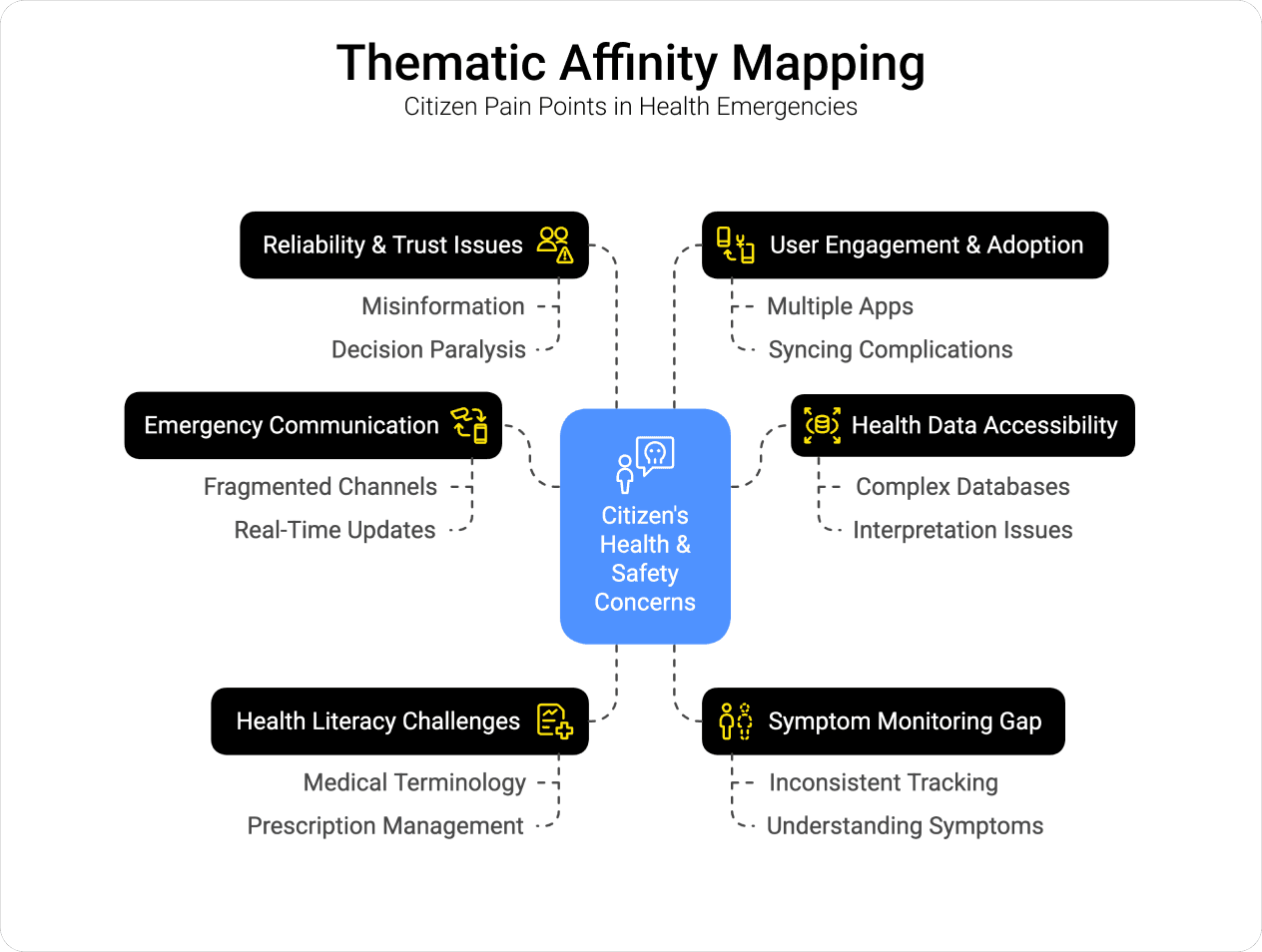 To rapidly identify and understand users core pain points during health crises, I utilized lean UX research methods fitting the 72-hour hackathon timeline: