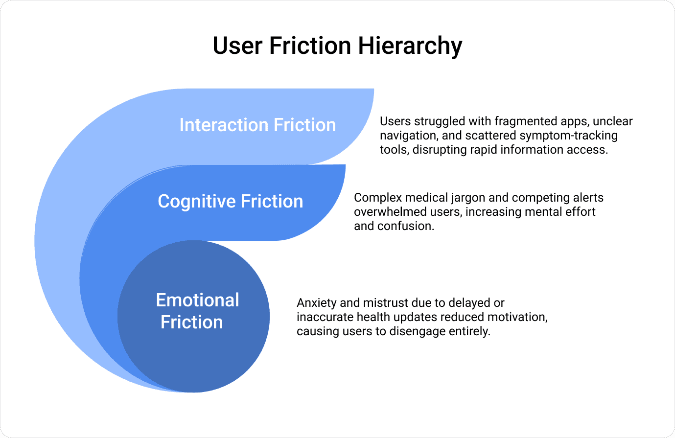 By applying the Hierarchy of User Friction framework, I prioritized user concerns from surface interaction issues through deeper cognitive (information overload) to emotional friction (anxiety, trust issues).